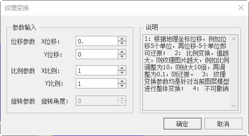 “纹理变换”功能其操作为单向性,不可撤销,因此如果想恢复原来的纹理参数,需反向进行操作,如“x位移”设为“5”,恢复原理纹理坐标时则需要将“x位移”设为“-5”。建议操作前将待操作的数据备份。