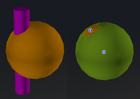 设置完参数后,点击“切割”按钮,系统自动完成切割,并将结果加载到工作空间。下图所示为圆柱切割前后对比,左图球体经过圆柱体切割后变成了右图①、②两部分(①中另一部分在球体底部被遮挡)。
