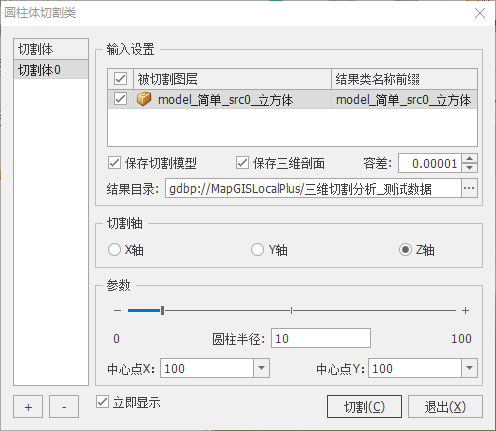 - 【模型分析】面板 -> 【通用分析】->【模型切割】->【圆柱体切割】