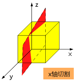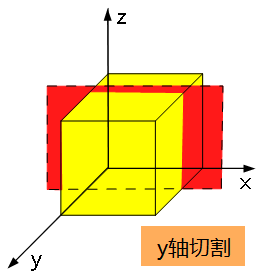【切割轴】:有X、Y、Z三个方向可供选择,用户可通过点击选择一个方向面作为切割面。如下图所示,红色面为切割面,黄色物体为待切割面或体;