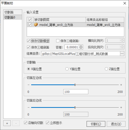 切割输入设置。勾选待切割的模型数据。具体的参数涵义见功能“平面剖切”;