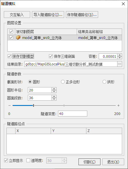 - 设置切割参数。设置隧道截面类型、截面参数、隧道深度,还可编辑隧道路径点;