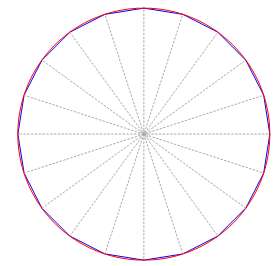 - 【圆面段数】:真实的圆可以认为是有无数个边的正多边形,但在计算机模拟中,不可能设置无限个边,且边个数越多,数据量越大,对数据绘制的效率影响也越大。尤其在三维场景中,为保证模型显示效率,圆在场景中是由正多边形替代的。如下图所示,红色线为圆形,蓝色线为正20边形,可发现蓝色线基本可与红色线重合。用户可手动设置正多边形边个数,个数越大,越接近圆,但显示效率越低;
