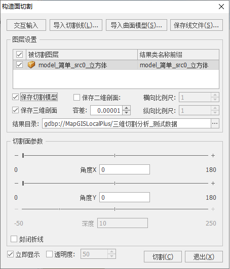 “构造面剖切模型”命令,选择待切割的模型图元,该图元会高亮显示。在模型上点击鼠标左键交互绘制切割面走向;绘制完成后点击右键结束,系统弹出如下所示对话框: