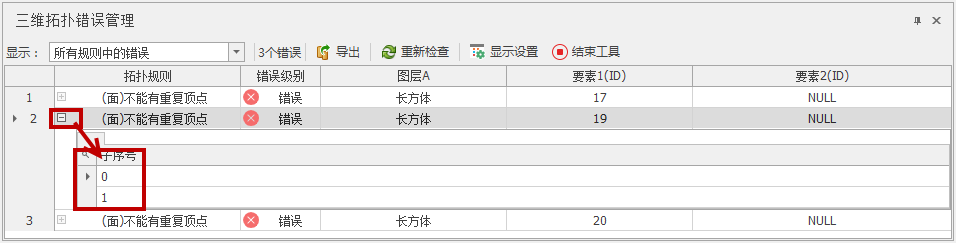 选择待检查的三维点/线/面/体、拓扑规则及错误等级;
