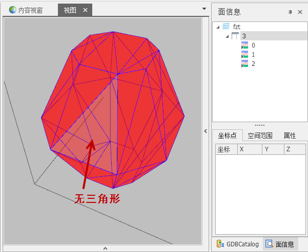 “孤立顶点”:面内存在未被任何三角形引用的点。一般情况下,孤立顶点属于数据的冗余点,没有意义,建议删除。可通过“交互显示单面信息”功能查询模型单面及三角形信息。