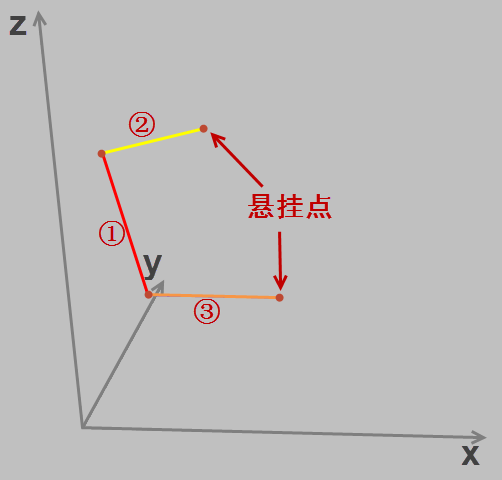 如下图所示三条线段分别用不同颜色表示,其中②和③均有一个端点没有与其他端点相连,属于悬挂弧段;①不属于悬挂弧段。