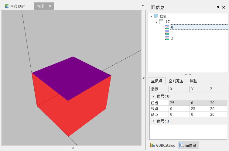 以如下长方体为例,是一个独立的三维要素,对应了一条属性记录,但是查看单面信息时,可发现其由三个面组成(顶面、底面和侧面)。若该三维要素是三维面,属于多部分;但若该三维要素是三维体,则不属于多部分。