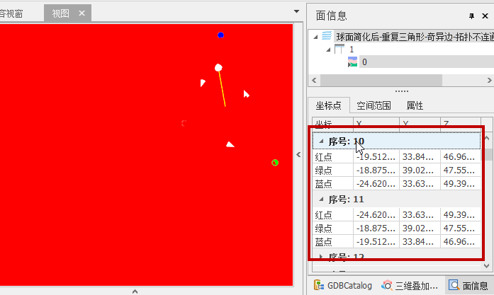 此处的重复三角形属于数据存储错误,同一个三角形被存储两次,建议处理。如下图所示模型,查询单面信息时可发现“10号”和“11号”两个三角形使用的顶点一样(此处不是重复顶点),只是顺序不一致。