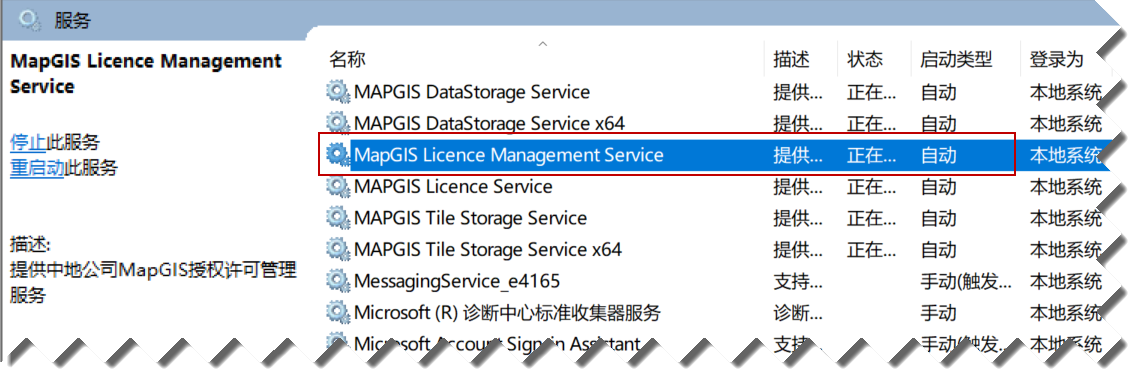 1. 认证服务器安装成功后,可在“服务”信息中查看到“MapGIS Licence Management Service”服务,请保证此服务处于启动状态;
