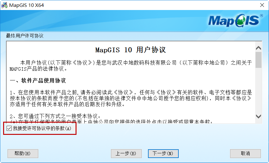 2. 点击【是】后即可开始安装,进入 MapGIS 安装界面。点击"下一步",确认用户许可协议,勾选【我接受许可协议中的条款】。