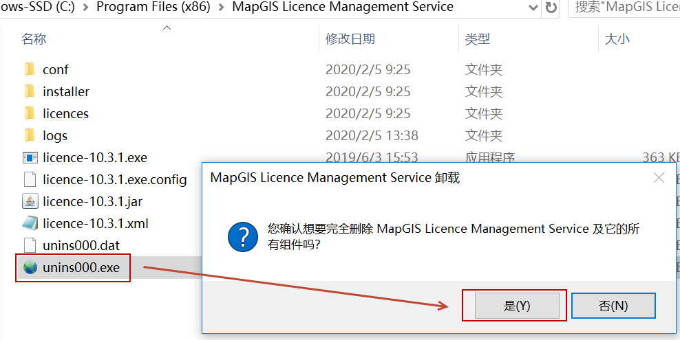 - 进入授权认证服务器安装目录,执行unins000.exe可完成卸载,如图所示:
