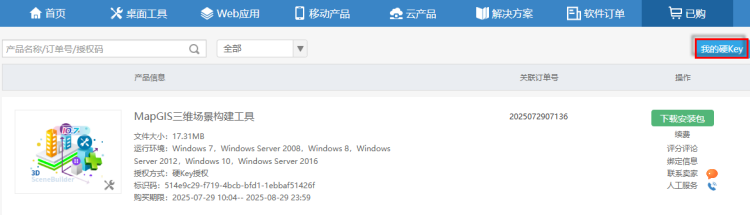 3. 在“云交易中心”-“已购”中选择产品,下载安装包页面选择下载硬Key授权文件;