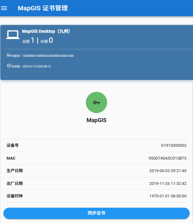 2. 打开浏览器,在地址栏输入http://授权服务器IP:端口即可,如http://127.0.0.1:8080,进入站点,插入硬key的USB设备,在MapGIS证书管理界面可查看到加密狗设备信息。