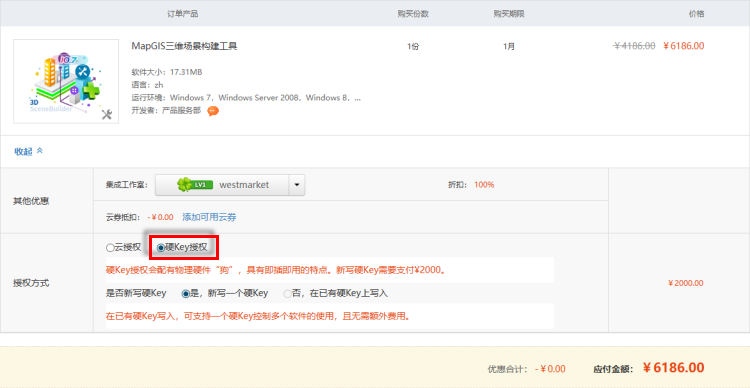 用户在云交易中心首次使用硬Key授权时,需支付2000元购买一个新的硬Key USB设备,此设备会在付款后7天内寄往用户的收件地址;当用户已有硬key USB设备时,用户可以选择重新再获取一个硬Key,也可以选择在已有的硬Key里面写入新的软件授权信息。