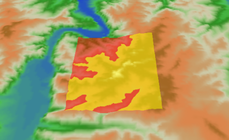 4. 显示填挖方区域信息和分析结果。在“平整高程”中填入欲平整的高度值(默认值为该片区域的最低海拔值),系统将自行计算出需要开挖和填充的区域。效果图如下,其中红色区域为填区域,黄色区域为挖区域: