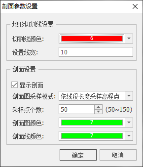 - 【显示剖面】:勾选后可在地形模型上显示绿色剖面,如上图即为勾选了“显示剖面”的效果;若不勾选,交互绘制剖面时只能看到线。
