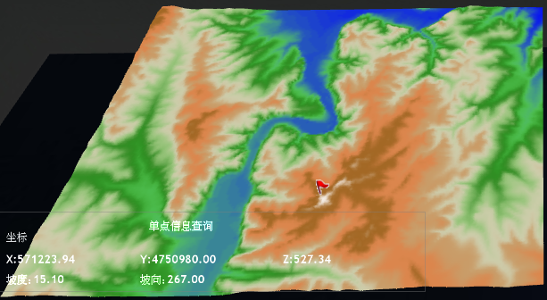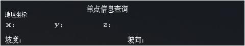 该功能实现在三维地形上,通过鼠标点击查询单个坐标点的X、Y、Z坐标值,坡度坡向值信息。
