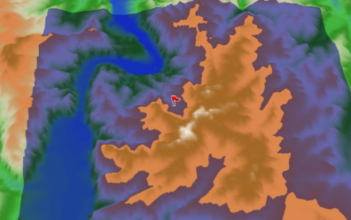 - 【选取淹没点】:点击“选取淹没点”,在视图区的地形图上选择一个点点击鼠标左键,地形上该点将出现一个小红旗,起始点决定淹没高度。