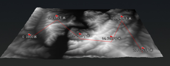 在三维地形上,通过该功能,可计算出两点之间的距离值。