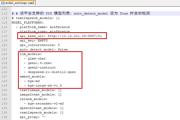 1. 修改"安装目录/config"目录下的"model_settings.yaml"文件,将"api_base_url"修改为服务器真实IP。"llm_models" 和 "embed_models"根据业务需求修改。