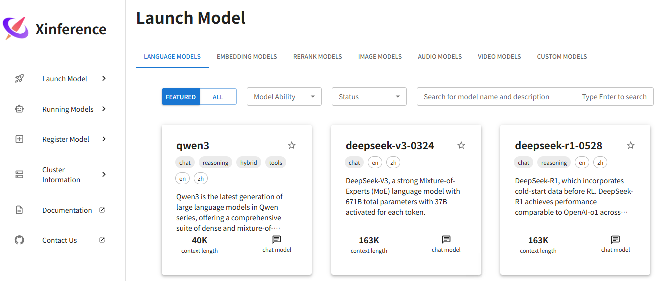2. 双击启动"安装目录/bin"目录下的"start-xinference-server.bat"脚本。成功后在浏览器输入http://IP:9997,可访问如下界面: