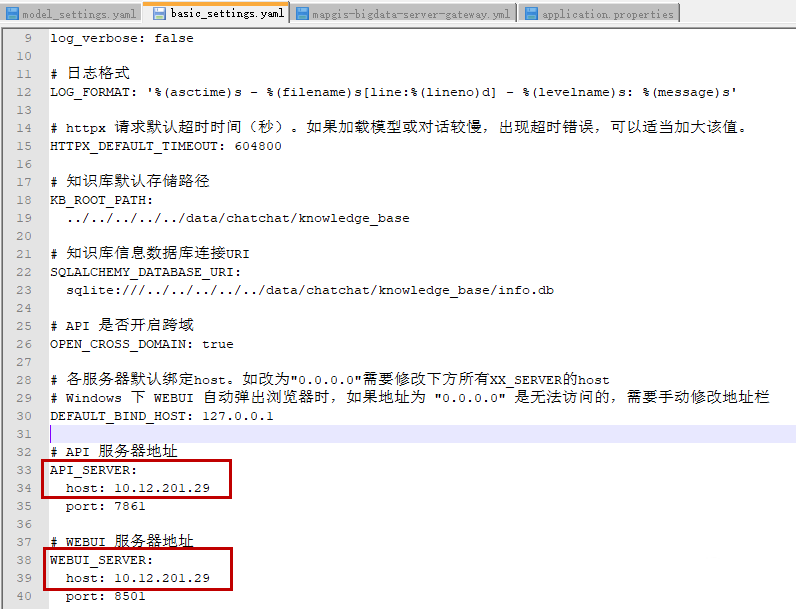 2. 修改"安装目录/config"目录下的"basic_settings.yaml"文件,将"API_SERVER" 和 "WEBUI_SERVER"修改为服务器真实IP。