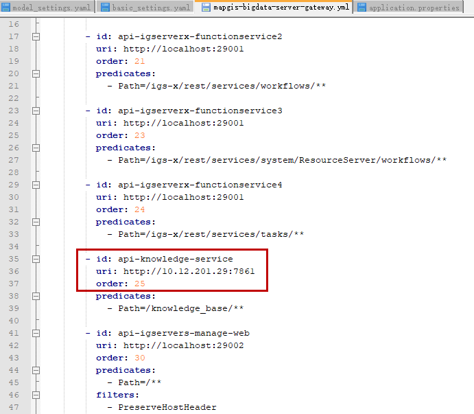 1. 修改"安装目录/config"目录下的"mapgis-bigdata-server-gateway.yml"文件,将api-knowledge-service的url修改为服务器正式IP。