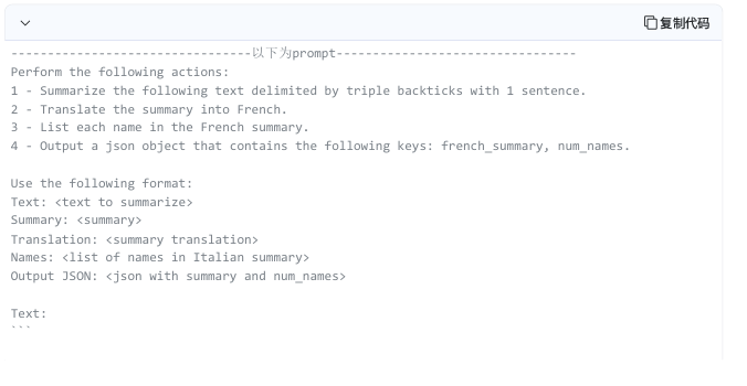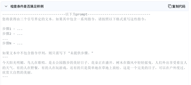 完成任务时要先检查是否满⾜这些条件,然后执⾏相应的策略,下⾯的例⼦要求⼤模型判断⽂本中是否包含了⼀系列指令