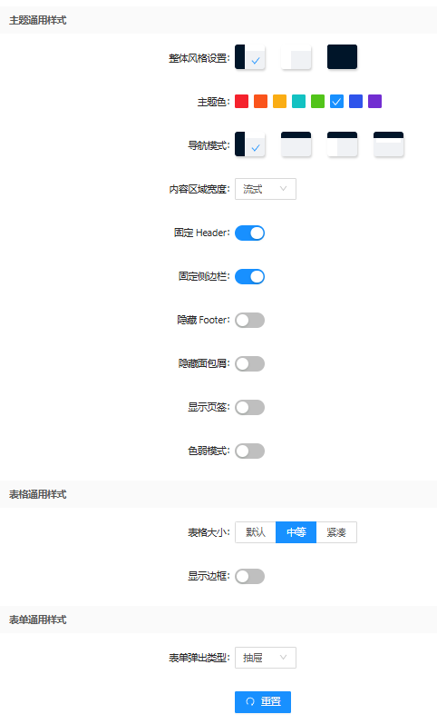 主题配置用于修改系统主题样式、表格样式、表单样式等。