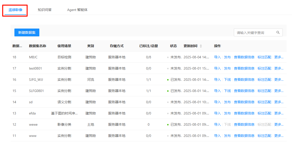2. 点击"新建数据集",可构建一个遥感影像数据集: