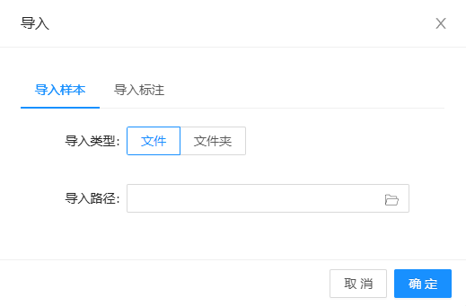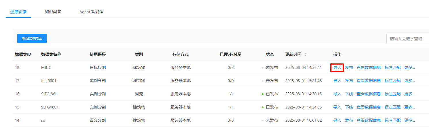 3. 新建完成后,在列表点击数据集后方的"导入",可选择导入样本数据和导入标注数据。