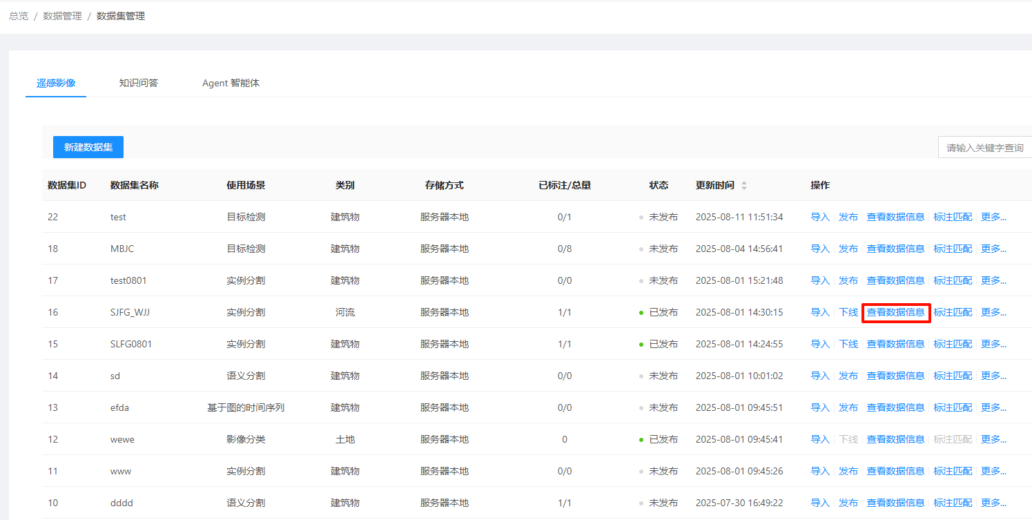 6. 点击列表后方的"发布",可发布该遥感影像数据集。