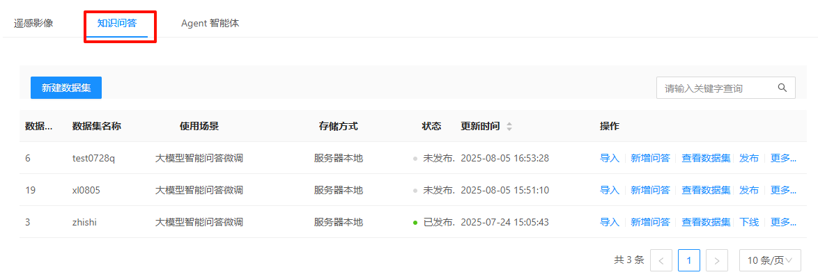 1. 登录系统,切换到"数据管理"->"数据集管理"->"知识问答"页面,列表中可显示所有知识问答数据集: