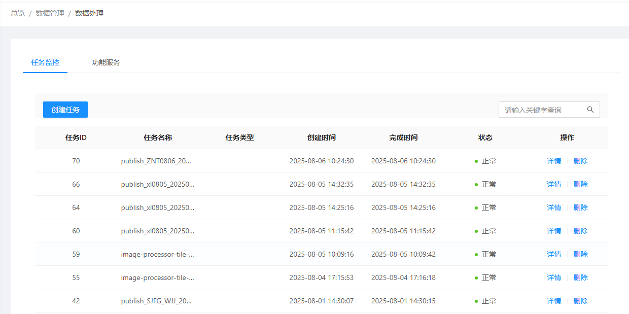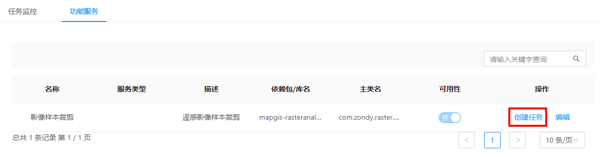 2.也可以直接在"数据处理"-"任务监控"中创建任务,跳转至"功能服务",创建及编辑任务,测试提供的功能服务是否能正确应用。