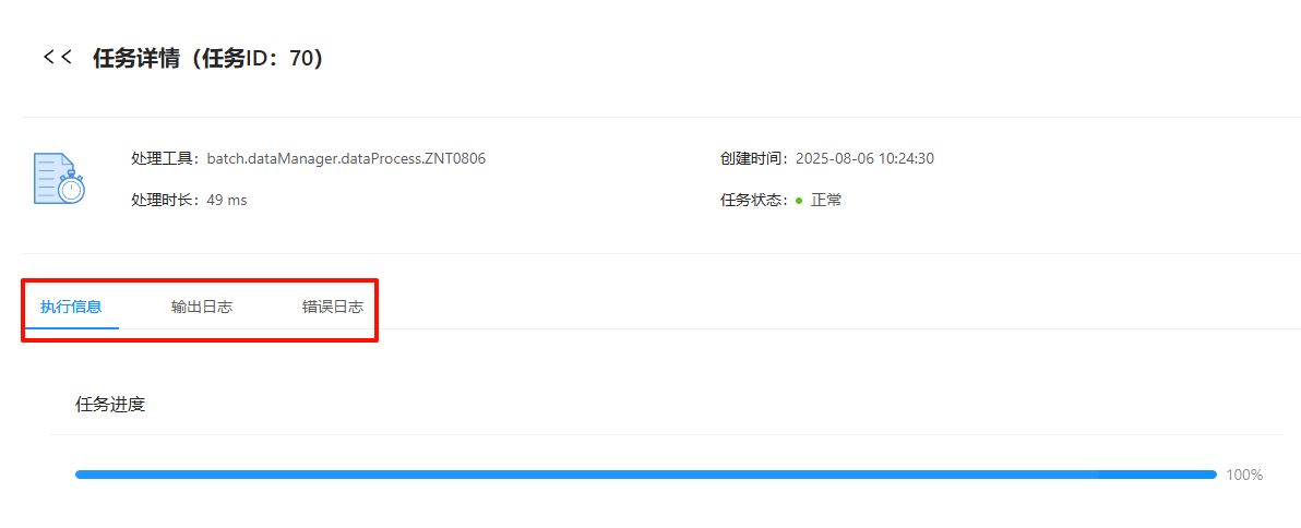 任务详情可以查看监控信息。如执行信息、输出日志及错误日志等信息。
