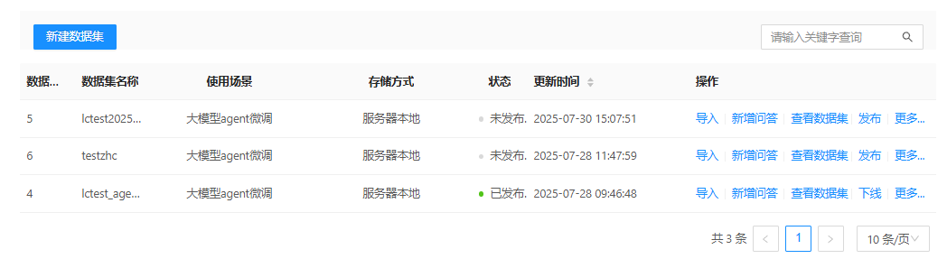 1. 登录系统,切换到"数据管理"->"数据集管理"->"Agent智能体"页面,列表中可显示所有Agent智能体: