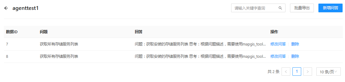 {"from": "assistant", "value": "问题:获取安装的存储服务列表 思考:根据问题描述,需要使用mapgis_tool工具,并设置api_type为0,key_value为空。 Action:{\"action\": \"mapgis_tool\", \"action_input\": {\"api_type\": 0, \"key_value\": {}}}"}]}4. 用户也可交互输入问答信息。点击数据集后方的"新增问答",即可交互输入问答信息。
