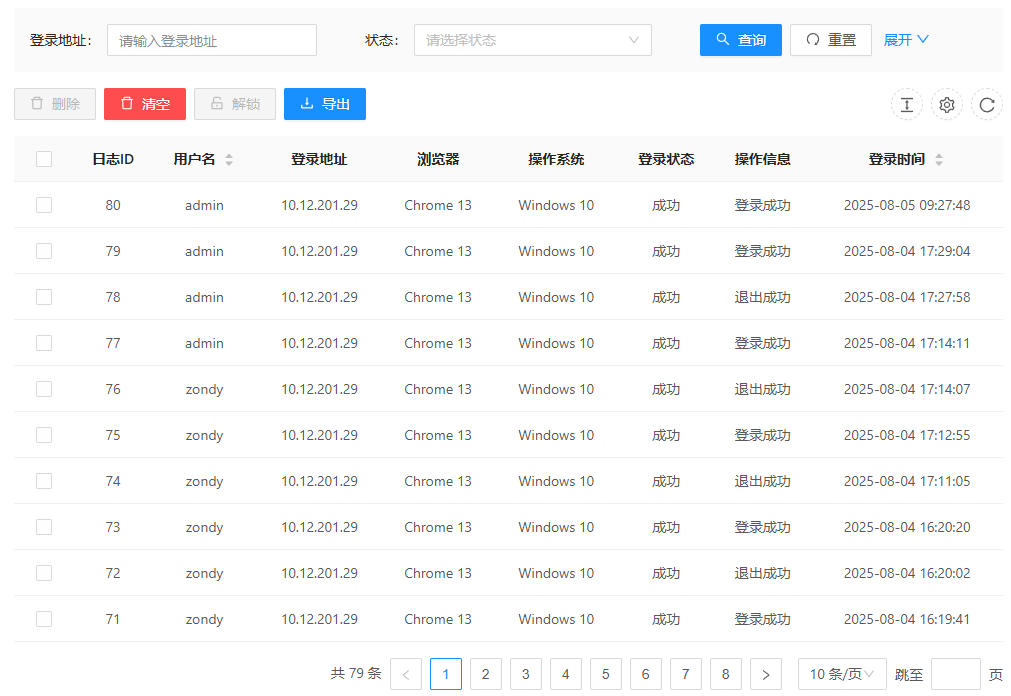 1. 切换到"日志管理"->"登录日志"页面,即可展示所有登录日志;