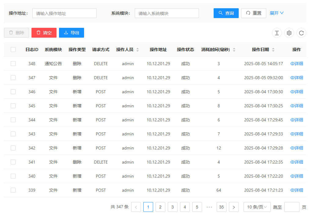 1. 切换到"日志管理"->"操作日志"页面,即可展示系统所有操作日志信息: