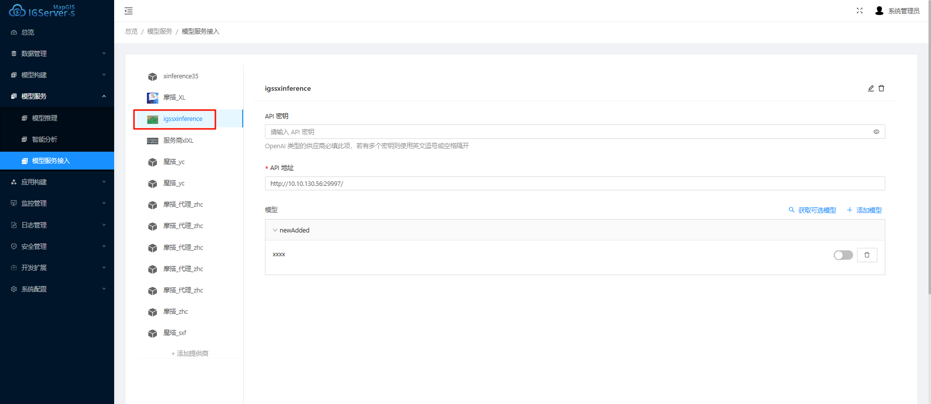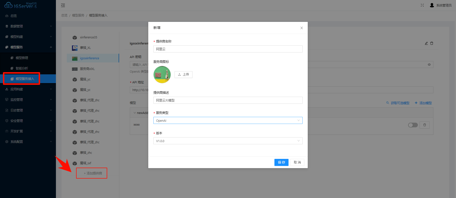 【添加模型】:可添加系统内置的模型服务,添加正确参数即可添加成功。