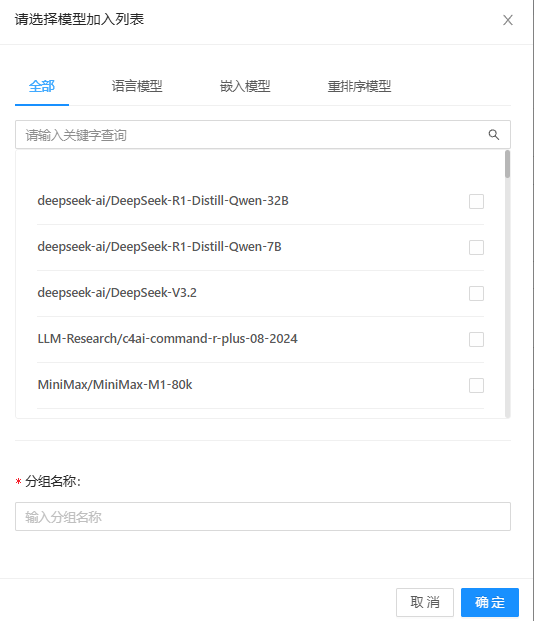 - 模型类型:选择模型类型,包括语言模型和嵌入模型两种;