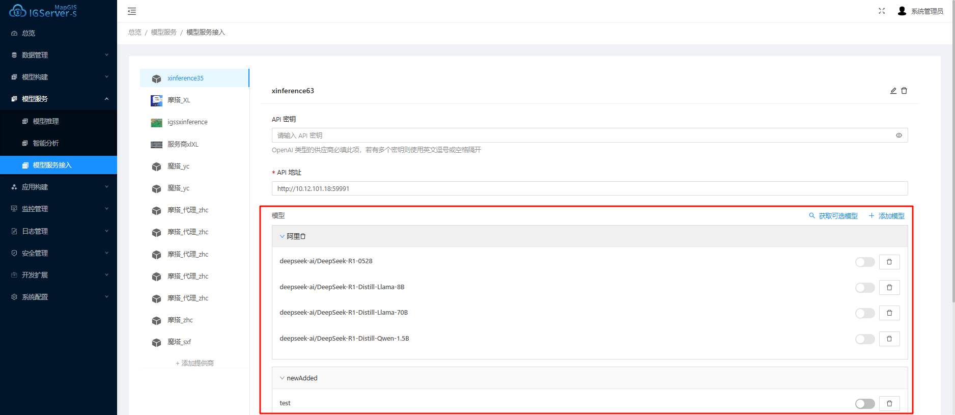 2.新建完成后点击“确定”,列表生成对应模型服务可进行API 地址及密钥配置,然后再根据需求添加对应的模型即可使用。