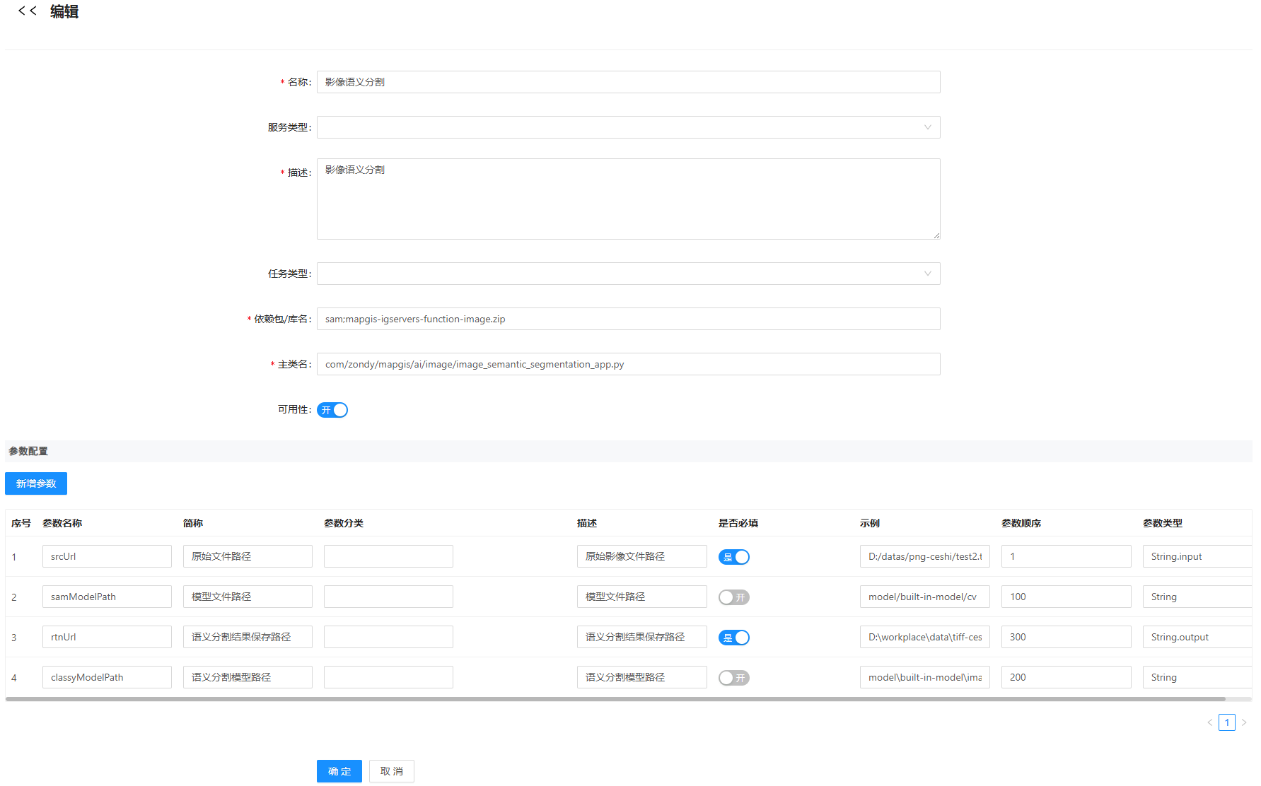 2. 点击"影像语义分割"后方的"编辑",可修改功能服务信息: