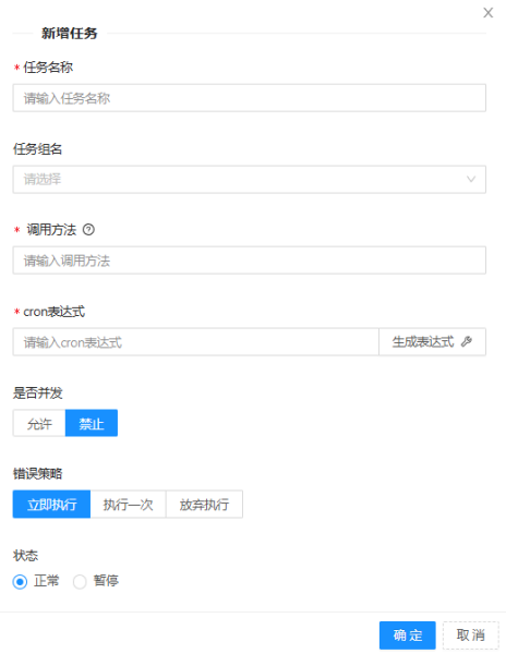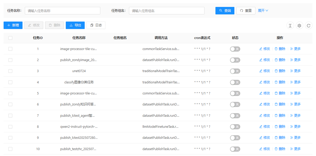 "定时任务"页面,进入如下所示页面,所有已创建的任务均可显示在列表中: 2. 点击"新增",可创建一个定时任务。 3. 点击某个任务后的"修改"按钮,可修改任务信息; 4. 点击某个任务后的"删除"按钮,再"点击"确认"可成功删除任务; 5. 点击...">