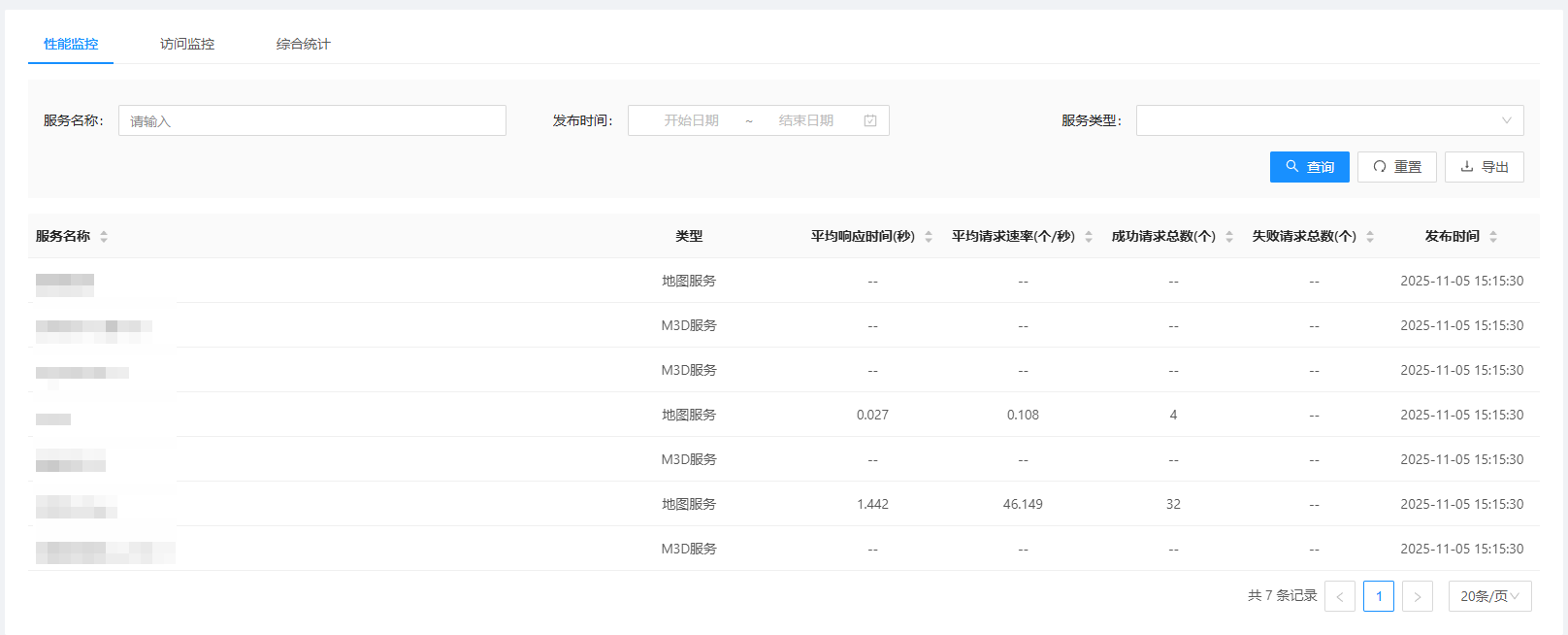 1. 登录MapGIS Cloud Manager,切换到"监控管理"->"服务实例监控"->"性能监控"页面,页面中会显示各服务的访问性能信息。