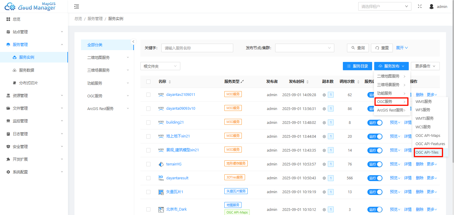 1. 在服务管理页面,点击【服务发布】-【OGC服务】-【OGC API -Tiles】,启动OGC API -Tiles服务发布页面;