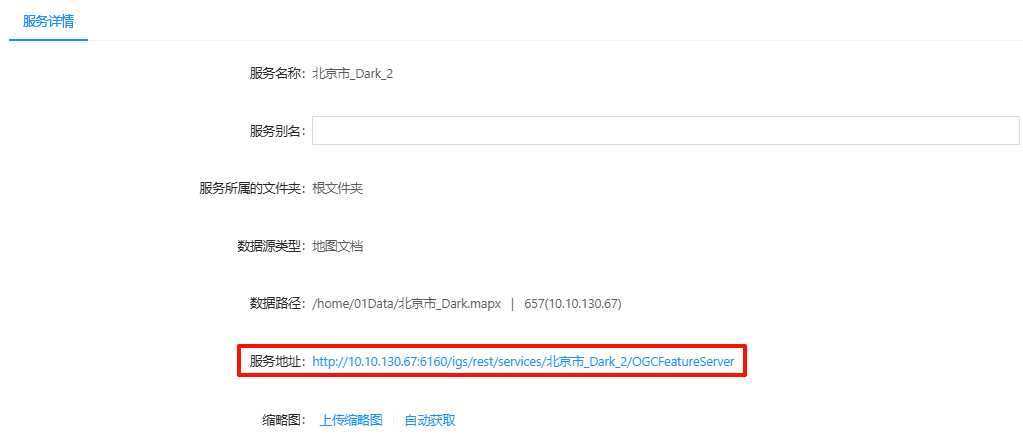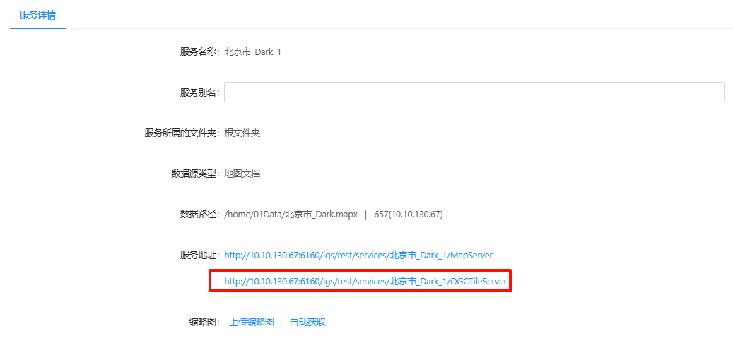 2. 发布WMTS服务成功后,点击进入服务详情页面,点击WMTS服务的"服务地址",可进入查看WMTS服务基地址页面。