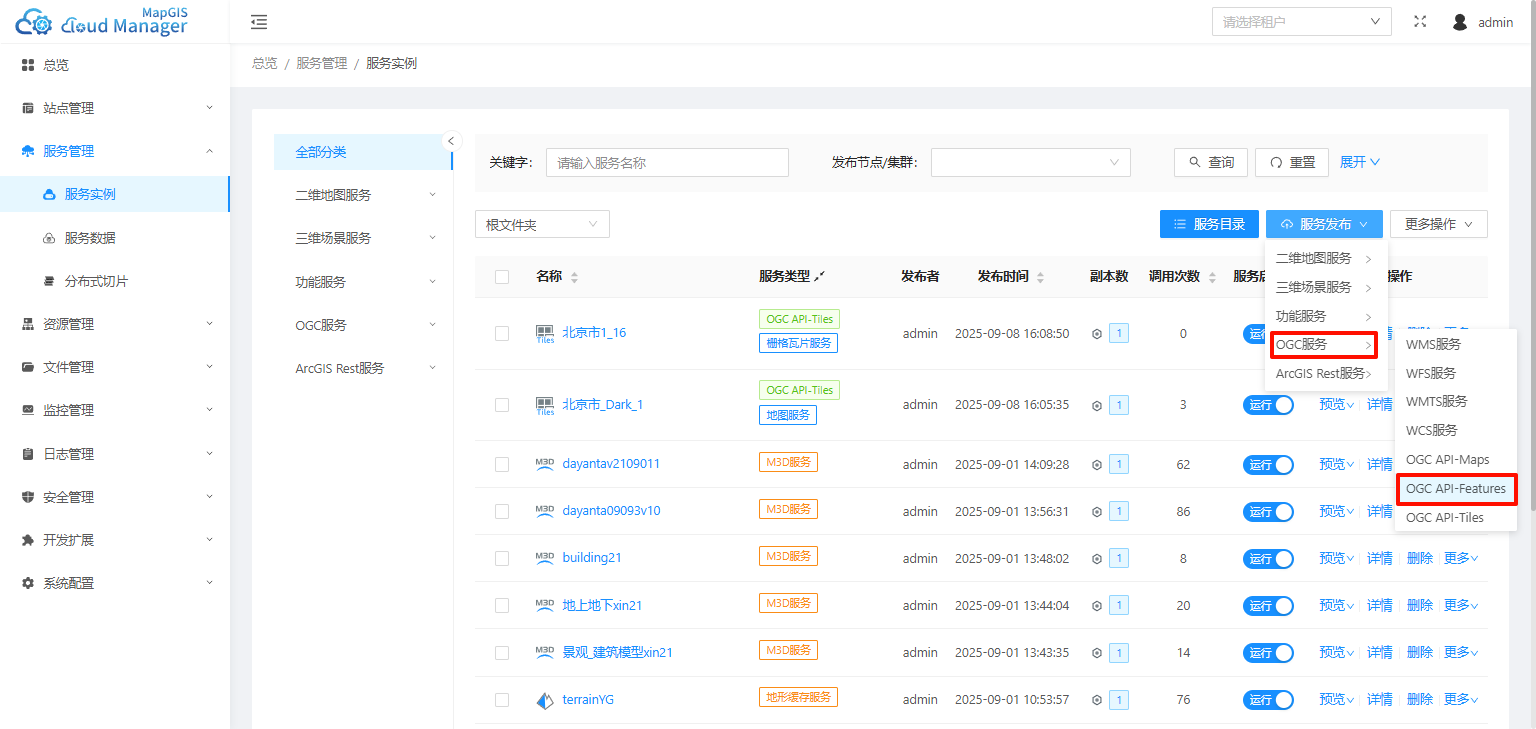 1. 在服务管理页面,点击【服务发布】-【OGC服务】-【OGC API-Features】,启动OGC API-Features服务发布页面;