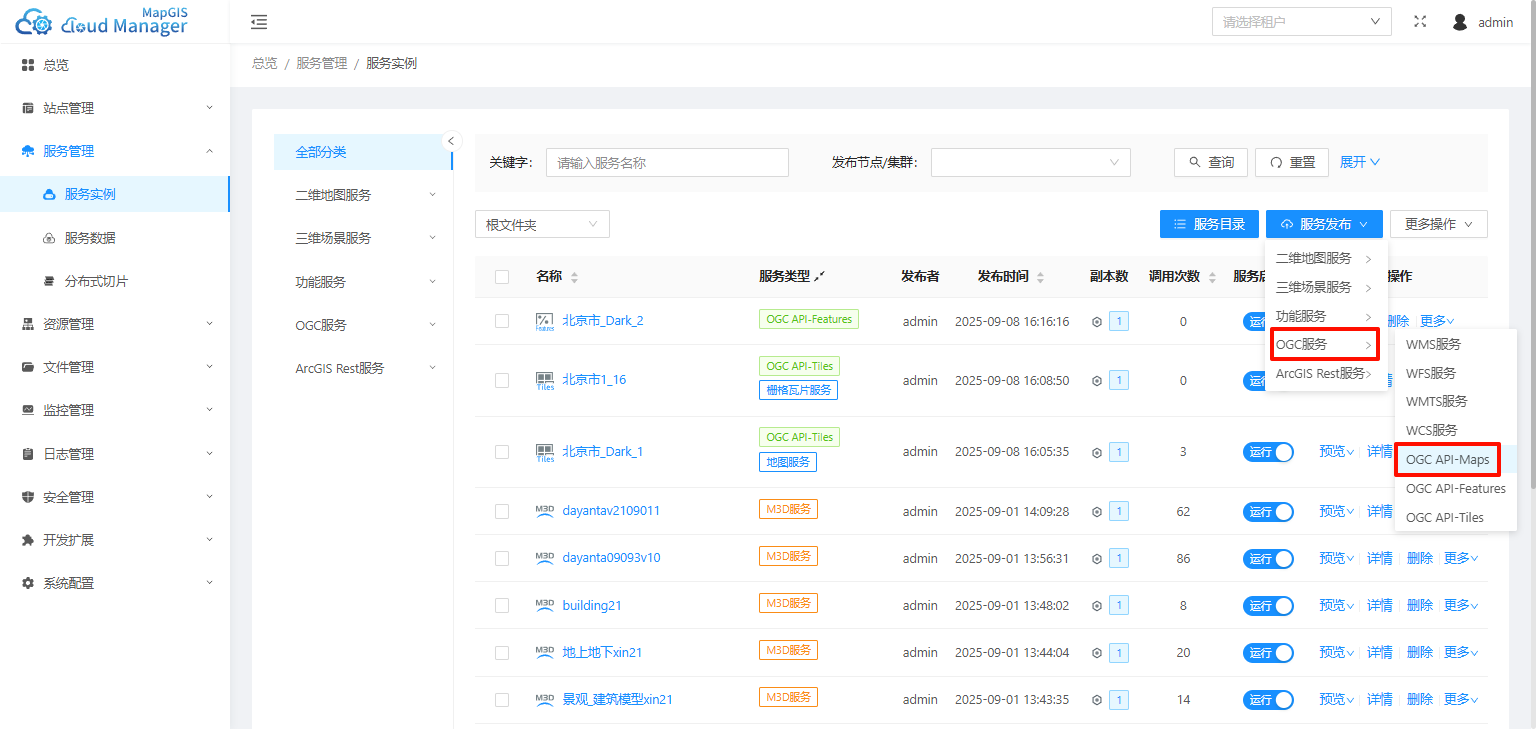 1. 在服务管理页面,点击【服务发布】-【OGC服务】-【OGC API-Maps】,启动OGC API-Maps服务发布页面;